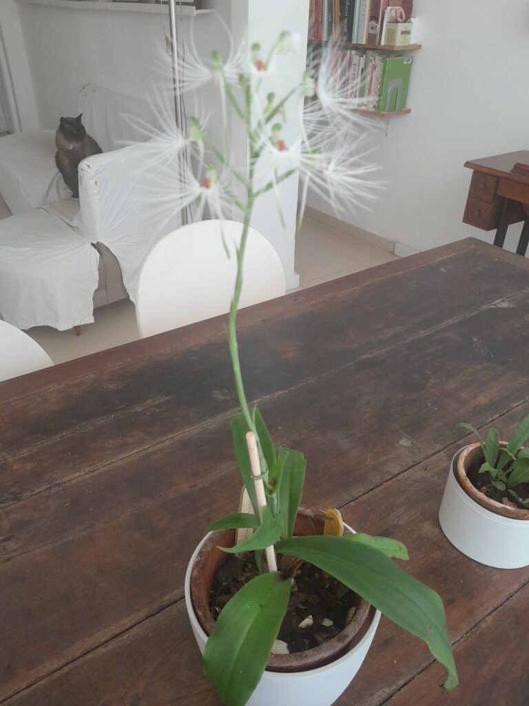 Dica: comece a sua coleção pelas terrestres. Fáceis de cuidar, não exigem muita atenção. Possuem bulbos que hibernam, folhas caem ou ficam adormecidas até a época da floração. Aqui faço uma inspeção diária para expulsar insetos interessados nas suas tenras folhas. Adubo com húmus de minhoca e casca de ovo. Penso em trocar de vaso, mas estão bem assim, então para quê mexer?