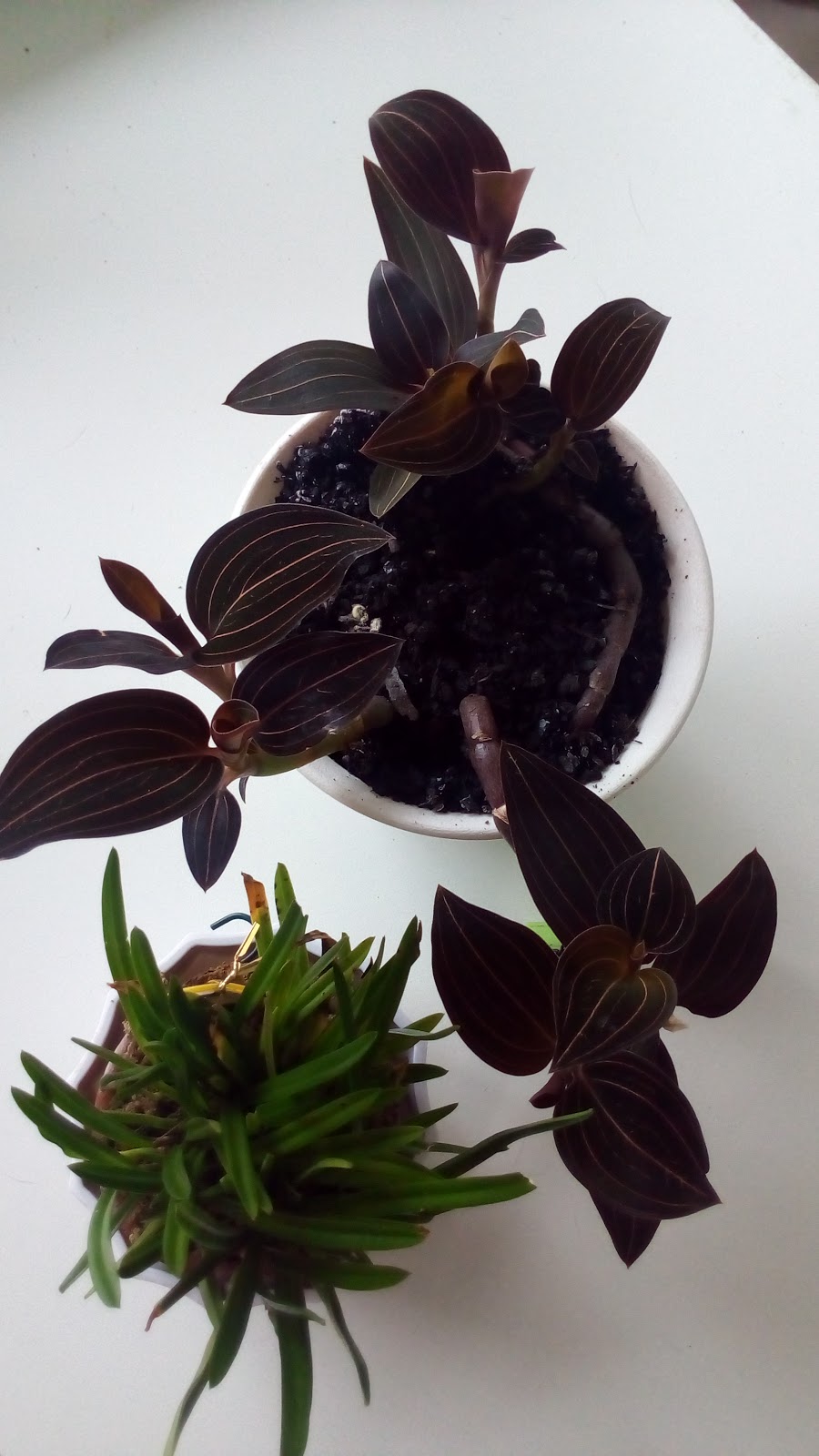 Uma destas orquídeas é a Ludisia discolor e a outra é a Dracula gigas. Perdi outros exemplares e estas duas são mantidas em local com luz e sol pela manhã e ficam no peitoril interno da cozinha, perto do fogão. Sempre estarão aquecidas e com umidade ambiente.