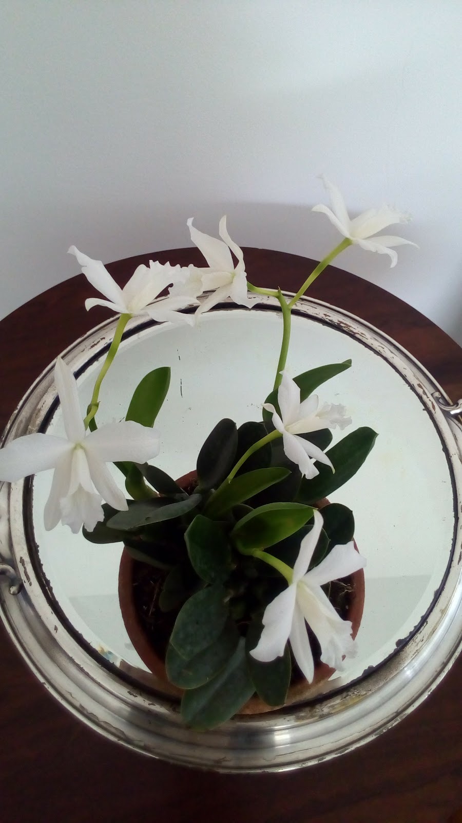 Fui tomar café no orquidário e me deparei com a floração dela. Seis flores abertas com um leve perfume no período da manhã.