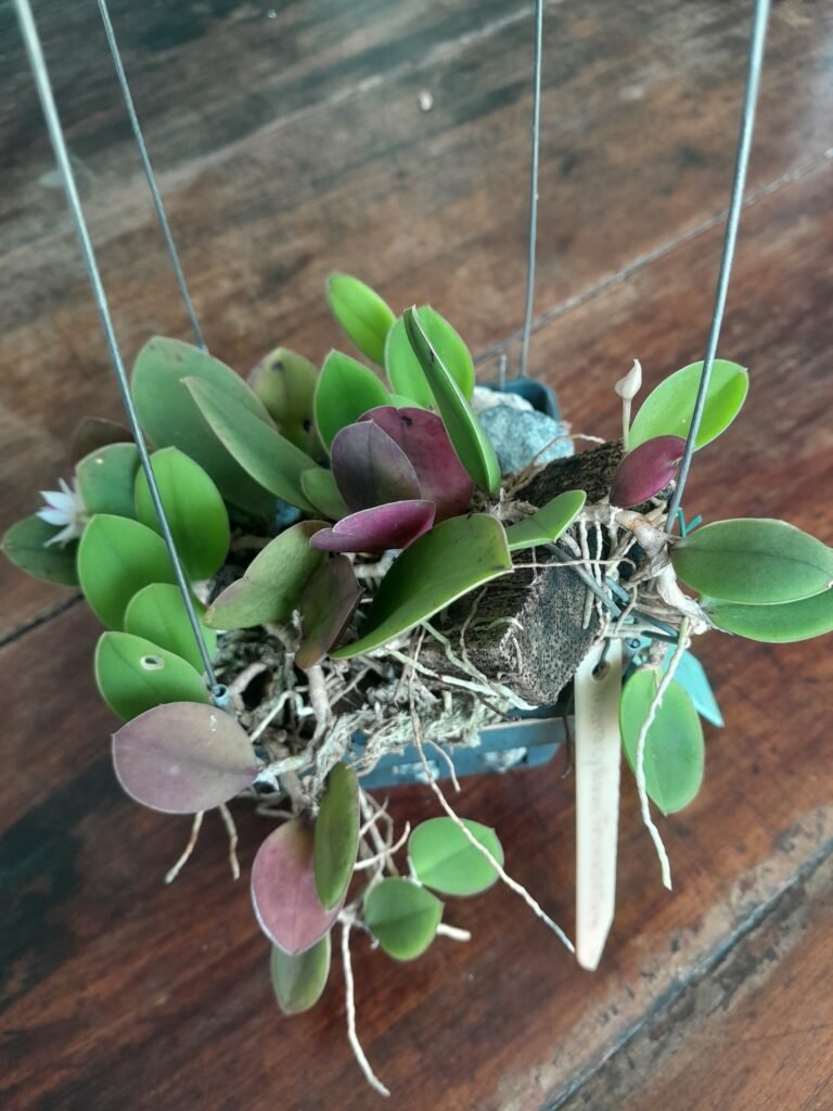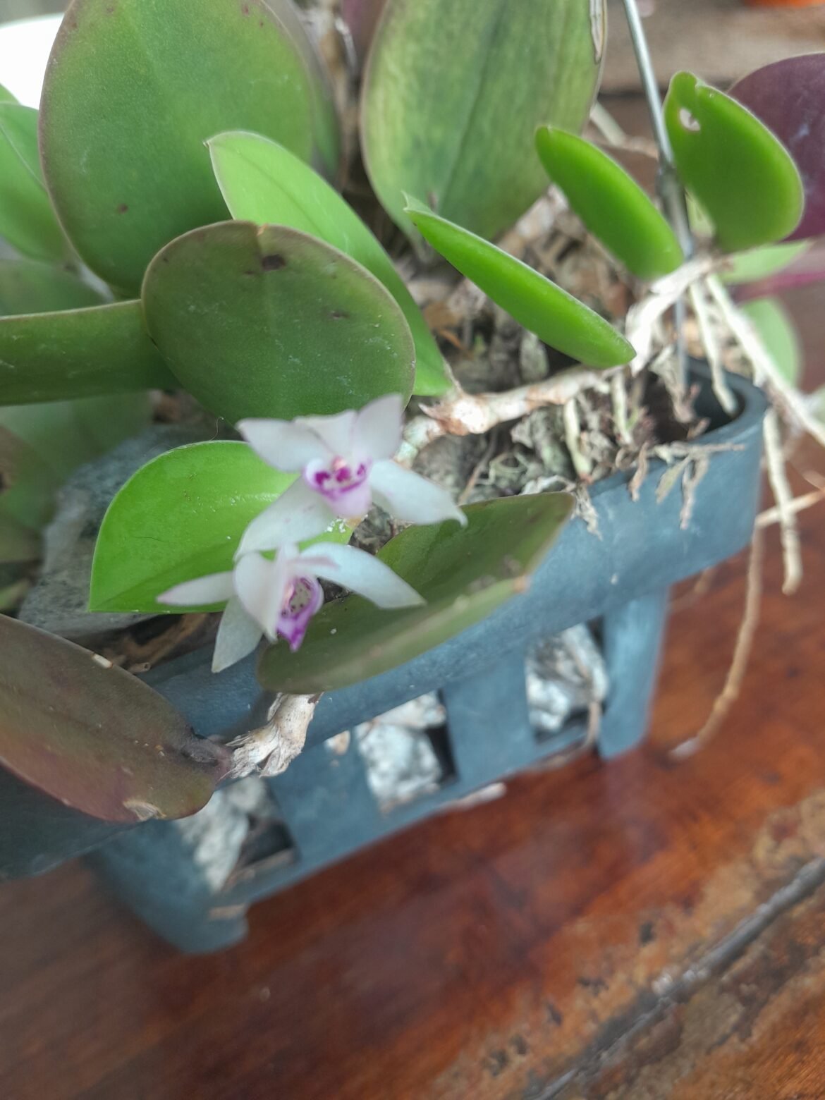 Veio plantada numa placa de madeira, acomodei numa cesta plástica e adicionei musgo, brita e casca de macadâmia tamanho pequena.